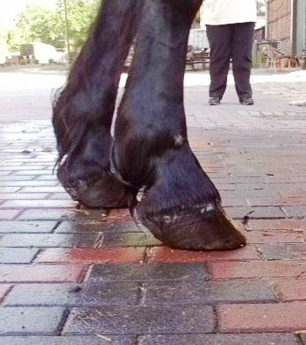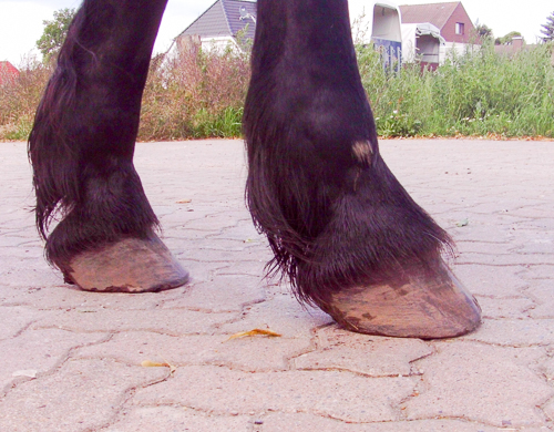 Hinterhufe vor der ersten Bearbeitung; nach vorn gebrochene Zehenachse durch zu hohe Trachten